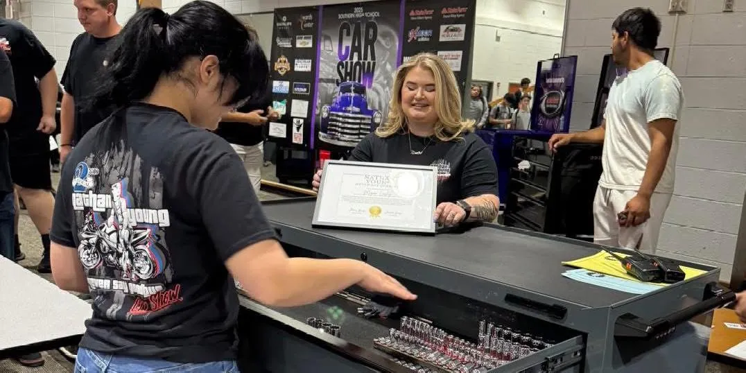 The toolboxes are presented to two graduating auto-program seniors at their end-of-year ceremony the following year. Southern Highschool staff and administration hand-select the students based on growth and career-readiness.